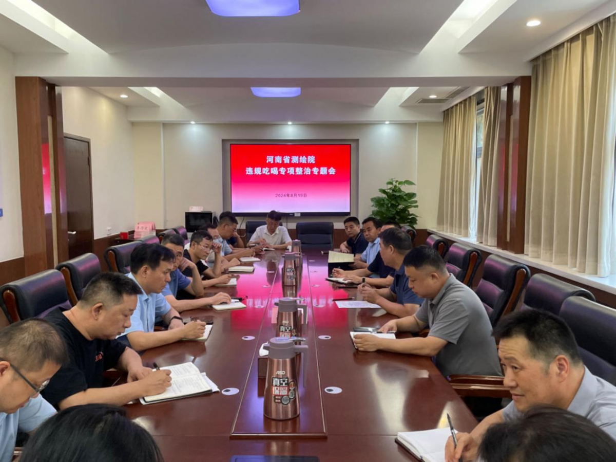 8月19日,河南省测绘院召开违规吃喝专项整治工作推进会。会议由院党委书记禹小伟主持,副院长禄二峰、侯岳及各科室负责人参加了会议。